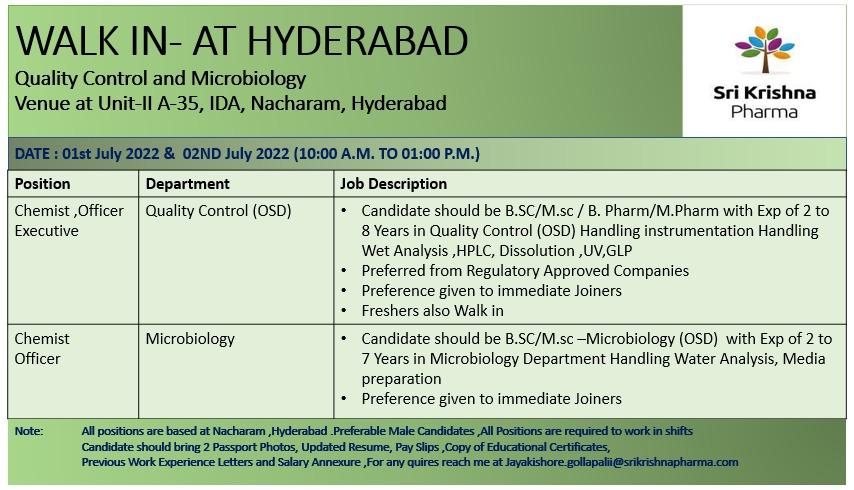 Sri Krishna Pharma Walk In Interview for Quality Control (OSD), Microbiology on 01st July 2022 & 02nd July 2022