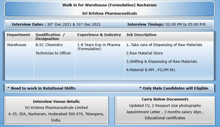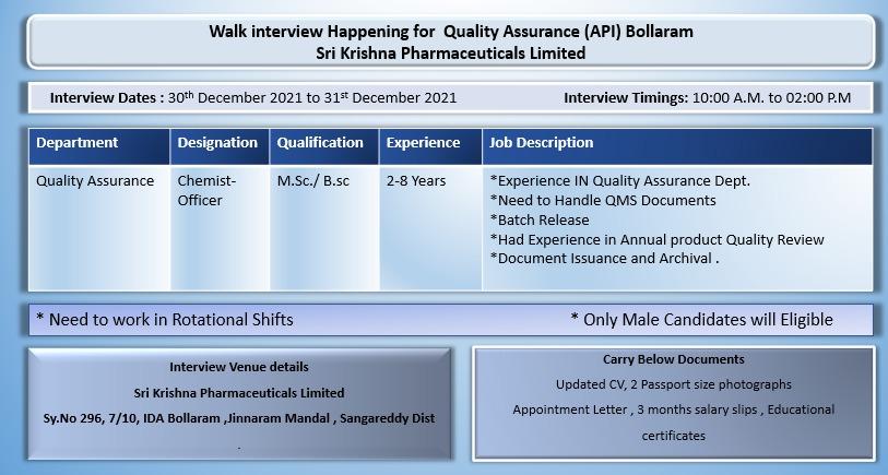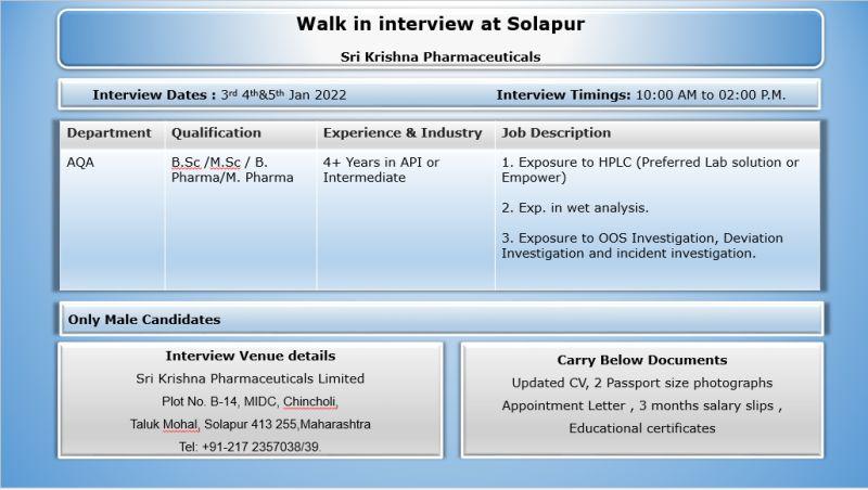 Sri Krishna Pharmaceuticals Ltd. Walk In Interview for Quality Assurance/ AQA & Warehouse Department on 30th, 31st Dec’ & 3rd , 4th, 5th Jan 2022