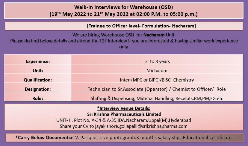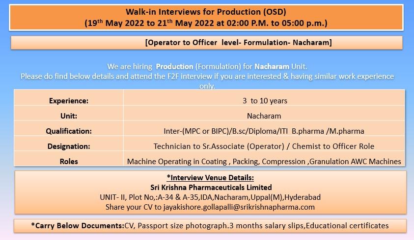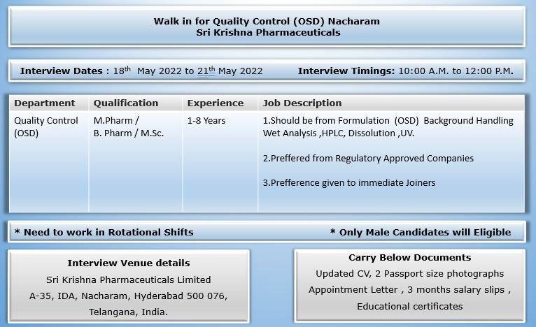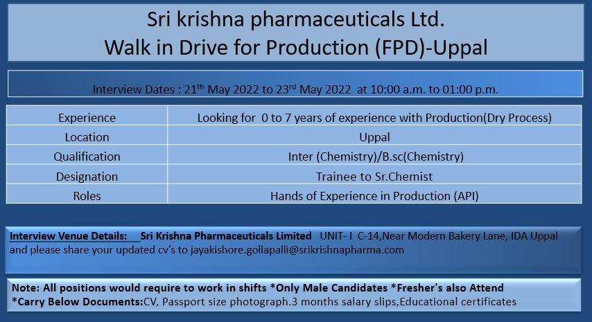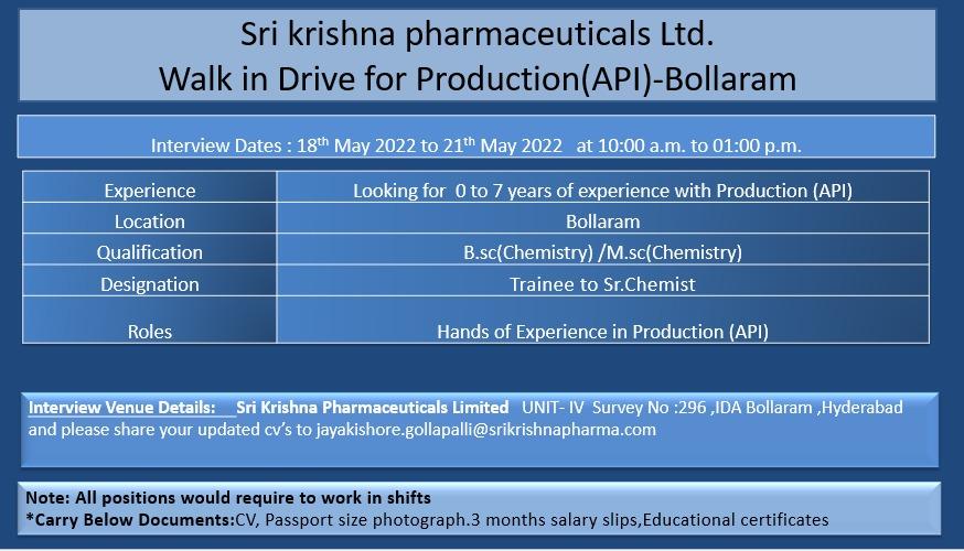 Sri Krishna Pharmaceuticals Walk In Interview for Freshers & experience Quality Control, Production & Warehouse on 21th to 23rd May 2022