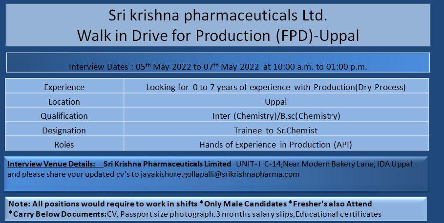 Sri Krishna pharmaceuticals Ltd. Walk in Drive for Production (FPD)-Uppal