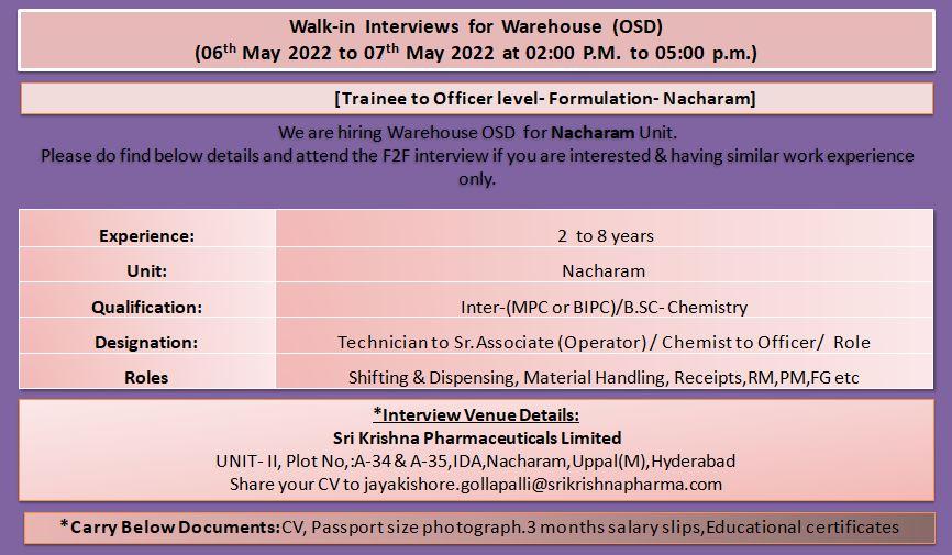 Interview Venue Details: Sri Krishna Pharmaceuticals Limited UNIT-1 C-14,Near Modern Bakery Lane, IDA Uppal and please share your updated cv’s to jayakishore.gollapalli@srikrishnapharma.com