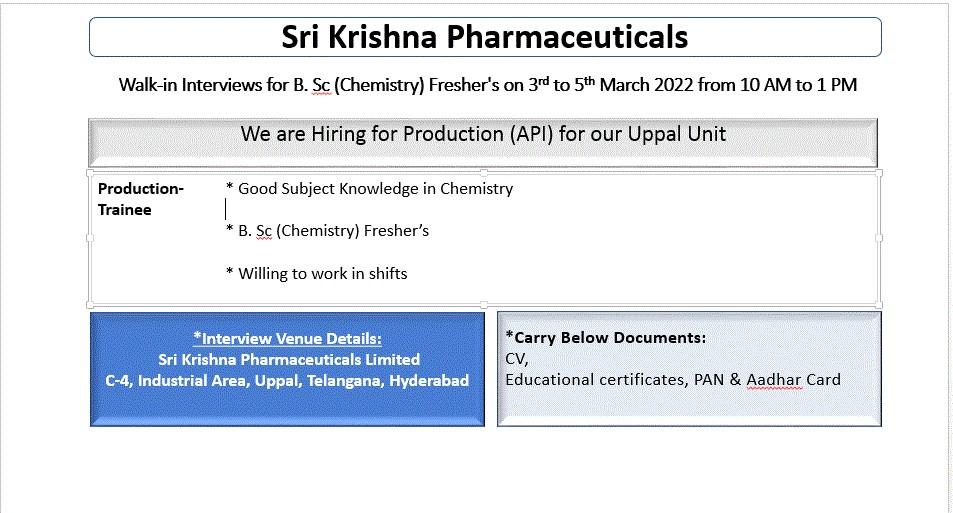 Sri Krishna Pharmaceuticals, Walk-In Interviews for B.Sc Chemistry Freshers on 3rd to 5th March 2022