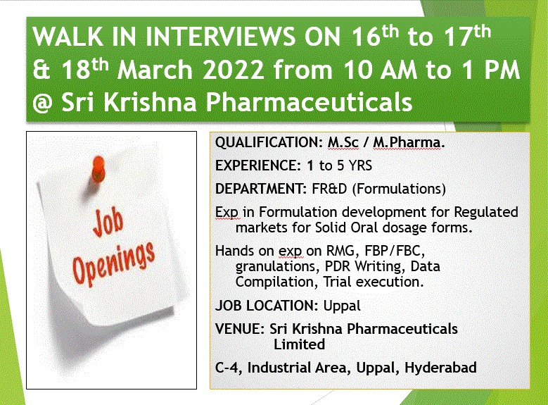 Sri Krishna Pharmaceuticals WALK IN INTERVIEWS for FR&D (Formulations) on 16th to 17th & 18th March 2022