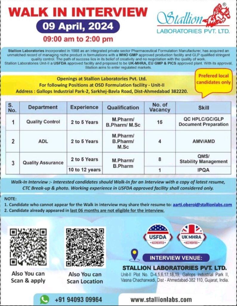 Stallion Laboratories OSD Formulation facility – Unit-II walk in interview for QA, QC, ADL on 09th April, 2024