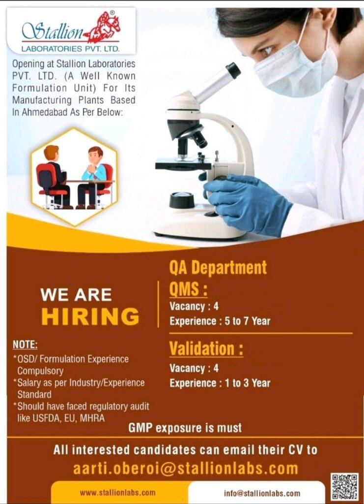 Stallion LABORATORIES PVT. LTD. Hiring for QA- QMS, Validation department
