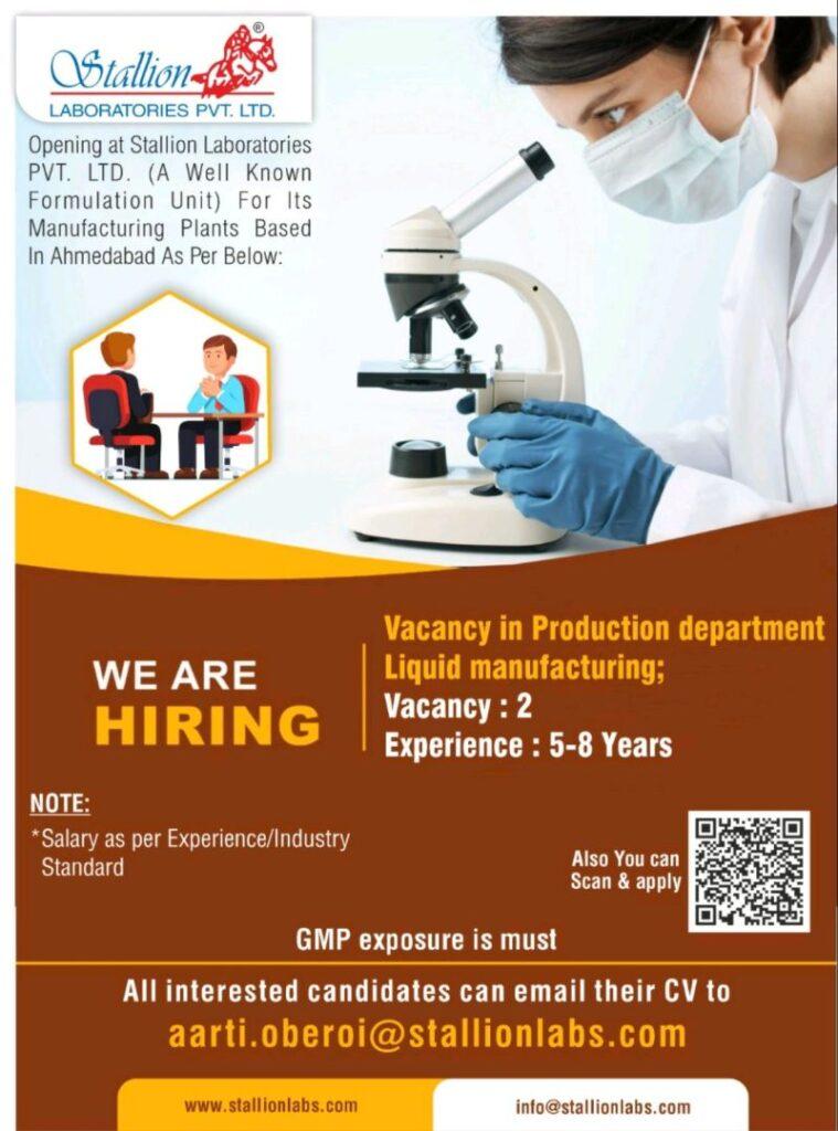 Opening at Stallion Laboratories PVT. LTD. (A Well Known Formulation Unit) For Its Manufacturing Plants Based In Ahmedabad As Per Below: