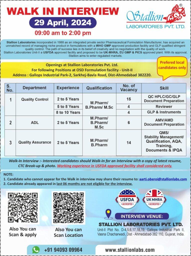 Stallion Laboratories walk in interview for Quality Control, Quality Assurance, ADL on 29th April, 2024
