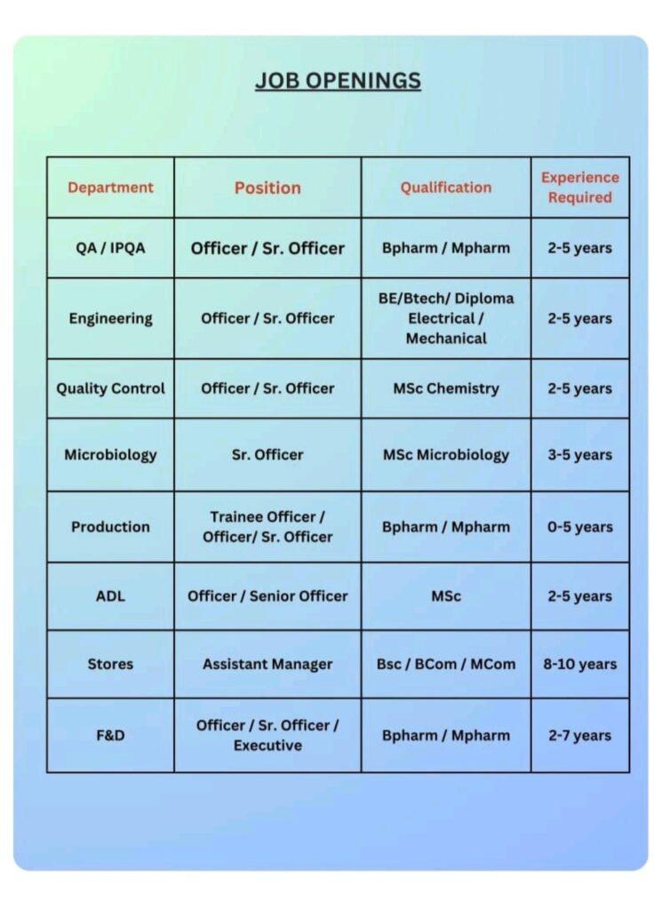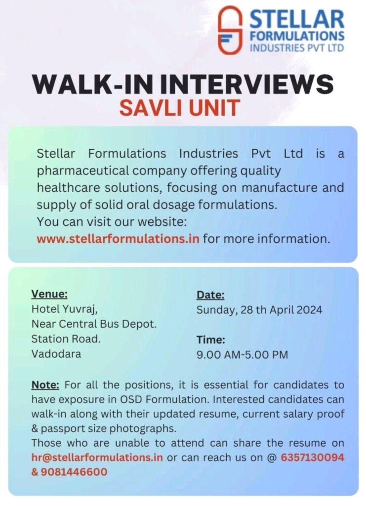 Stellar Formulations walk in interview for QA/ IPQA/ Engineering/ Quality Control/ Microbiology/ Production/ ADL/ Stores/F&D on Sunday, 28 th April 2024