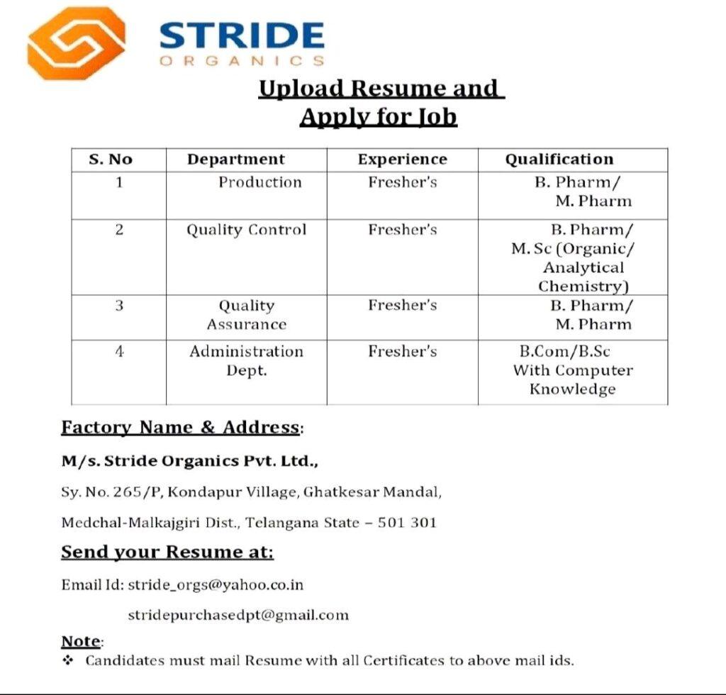 STRIDE ORGANICS- Hiring Fresher’s- B.Com/ B.Sc/ M.Sc/ B. Pharm/ M. Pharm for Production, QA, QC, Administration Dept. Apply Now