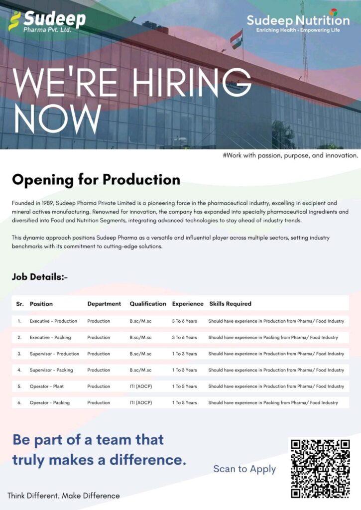 Sudeep Group is hiring for Operator/ Supervisor/ Executive- Multiple Opening for Production & Packing Department