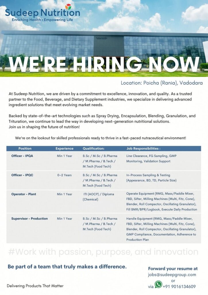Sudeep Nutrition, a leading partner to the Food, Beverage, and Dietary Supplement industries, has announced multiple job openings at its facility in Poicha (Rania), Vadodara. The company specializes in advanced ingredient solutions using state-of-the-art technologies like Spray Drying, Encapsulation, Blending, Granulation, and Trituration. They are currently looking for skilled professionals to join their fast-paced nutraceutical environment.