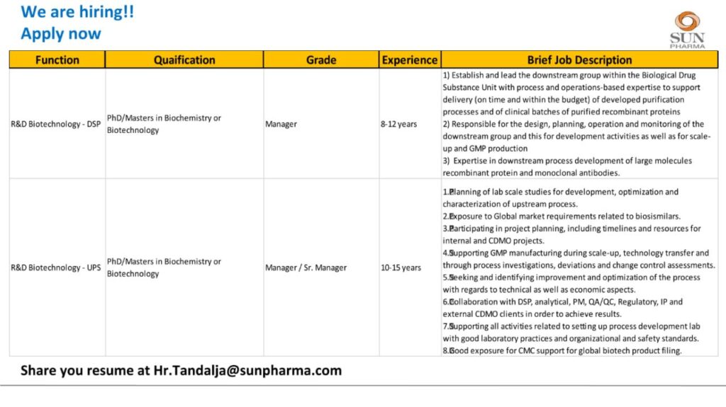 Sun Pharma is hiring for the position of Manager/ Sr. Manager – R&D Biotechnology (DSP/UPS).