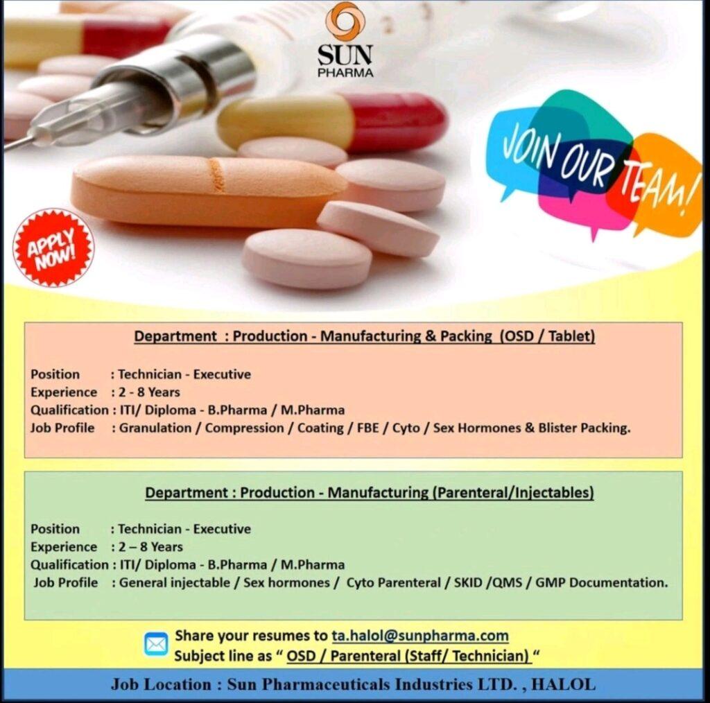 Share your resumes to ta.halol@sunpharma.com Subject line as “OSD/Parenteral (Staff/ Technician)”