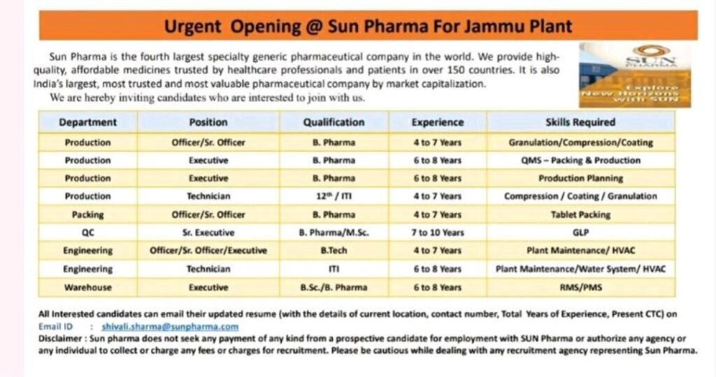 Urgent Opening @ Sun Pharma For Jammu Plant