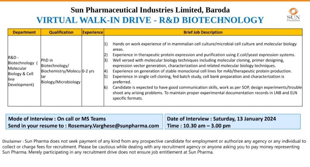 Sun Pharma Virtual Walk In Drive for R&D- Biotechnology on Saturday, 13 January 2024