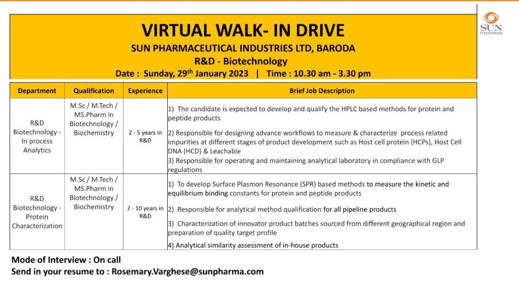 SUN PHARMA- Virtual Walk In Drive- R&D – Biotechnology on Sunday, 29th January 2023