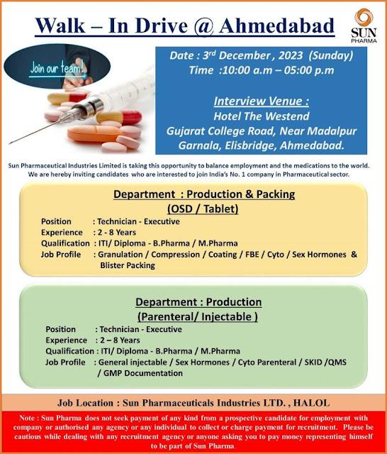 Sun Pharma Walk- In Drive @ Ahmedabad on 3rd December, 2023 (Sunday)