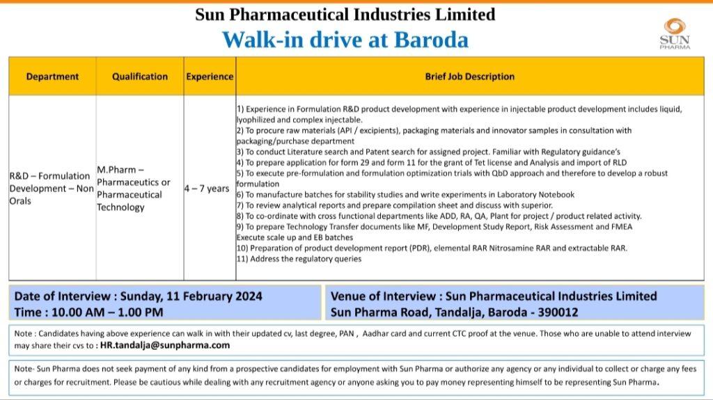 Sun Pharma Walk-in drive at Baroda on Sunday, 11th February 2024
