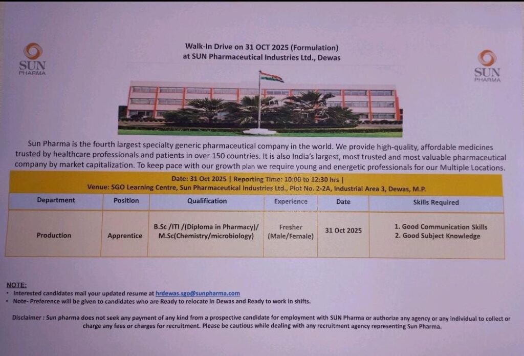 Sun Pharmaceutical Industries Ltd., India’s largest and most trusted pharmaceutical company, is conducting a Walk-In Drive for Apprentice positions in the Production department at its Dewas, Madhya Pradesh facility.