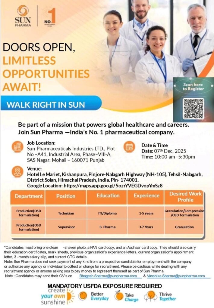 Join the mission that powers global healthcare and careers by walking in to interview with Sun Pharma—India’s No. 1 pharmaceutical company. We are looking for talented and experienced professionals to join our dynamic team.
