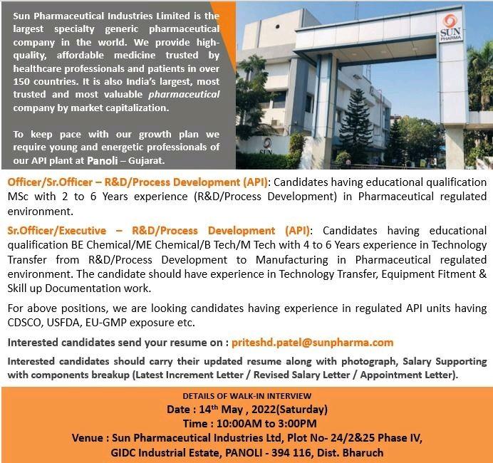 Sun Pharma Walk In Interview at Bharuch on 14th May, 2022