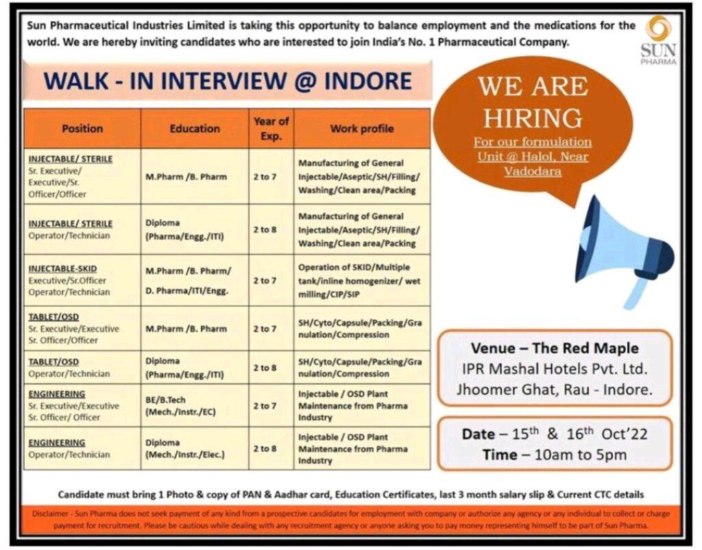 Sun Pharma Walk In Interview at Indore for formulation Unit @ Halol, Near Vadodara on 15th & 16th Oct’22 – INJECTABLE/ STERILE/ TABLET/ OSD/ ENGINEERING