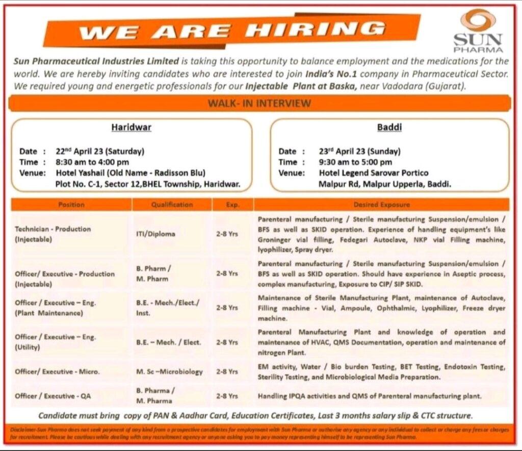 Sun Pharma- Walk In Interview for Production, Engineering, Micro, QA on 22nd & 23rd April 23 (Sunday)