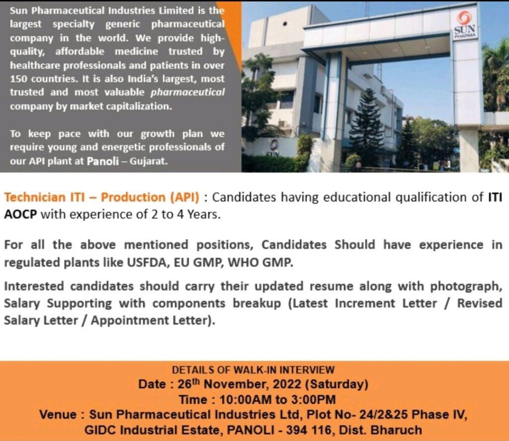 PHARMA JOBS POST > API > Sun Pharma Walk In Interview for Technician ITI – Production (API) on 26th November, 2022