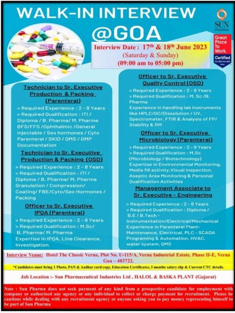 SUN PHARMA Walk in Interview on 17th & 18th June 2023 at Goa