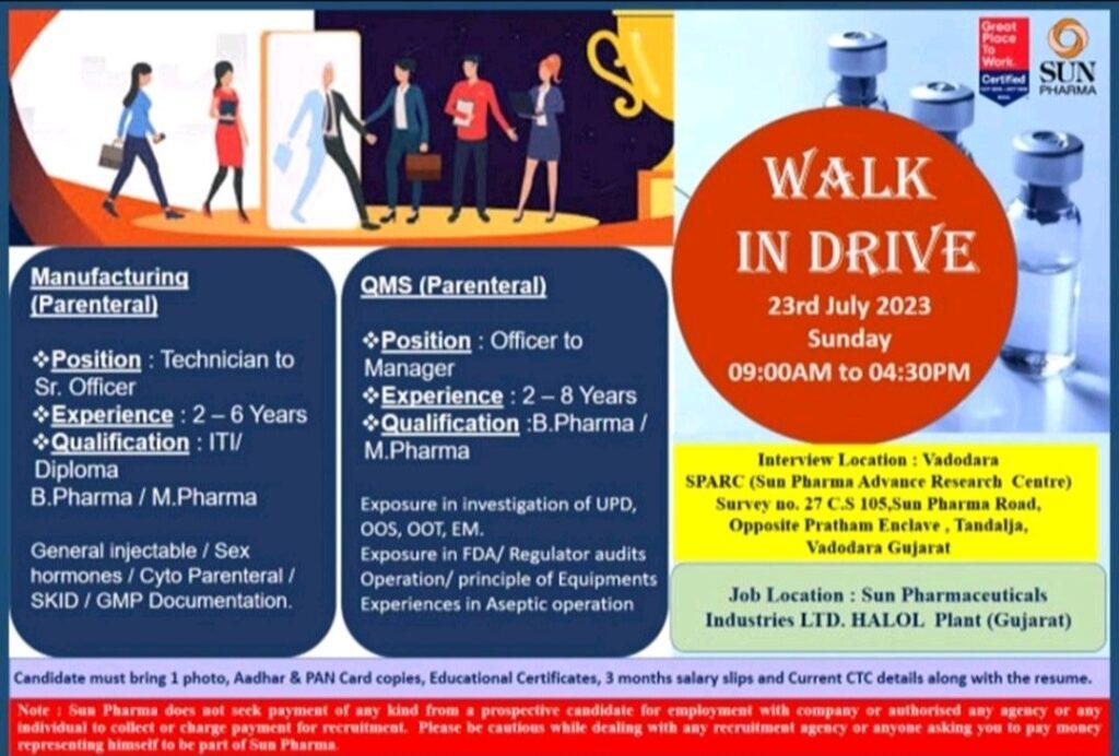 Sun Pharma Walk In Interview on 23rd July 2023 Sunday