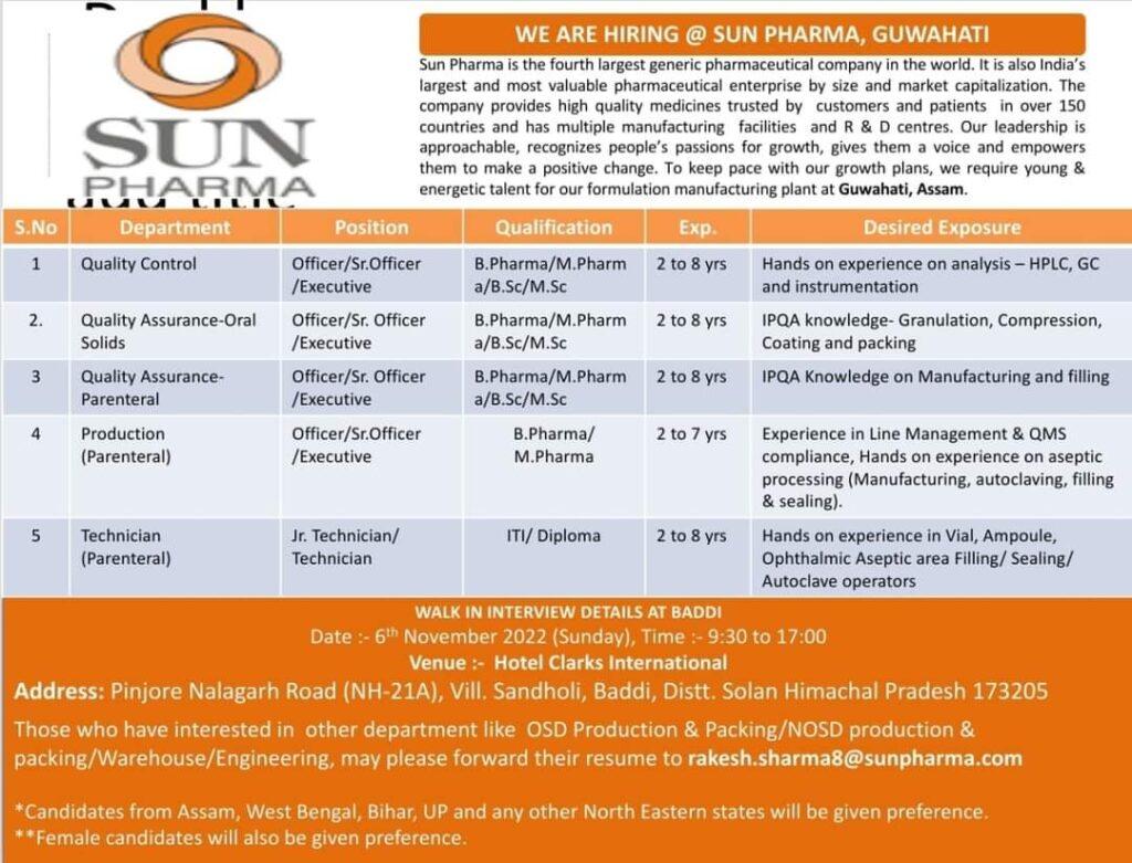 Sun Pharma Walk In Interview for Quality Control, Quality Assurance-Oral Solids, Quality Assurance Parenteral, Production (Parenteral), Technician (Parenteral) department on 6th November 2022 (Sunday)