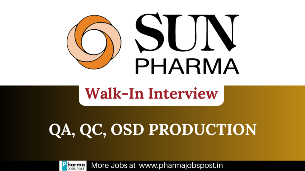 Sun Pharma- Walkin Drive for Quality Assurance, Quality Control, OSD Production department on 24th June 2023