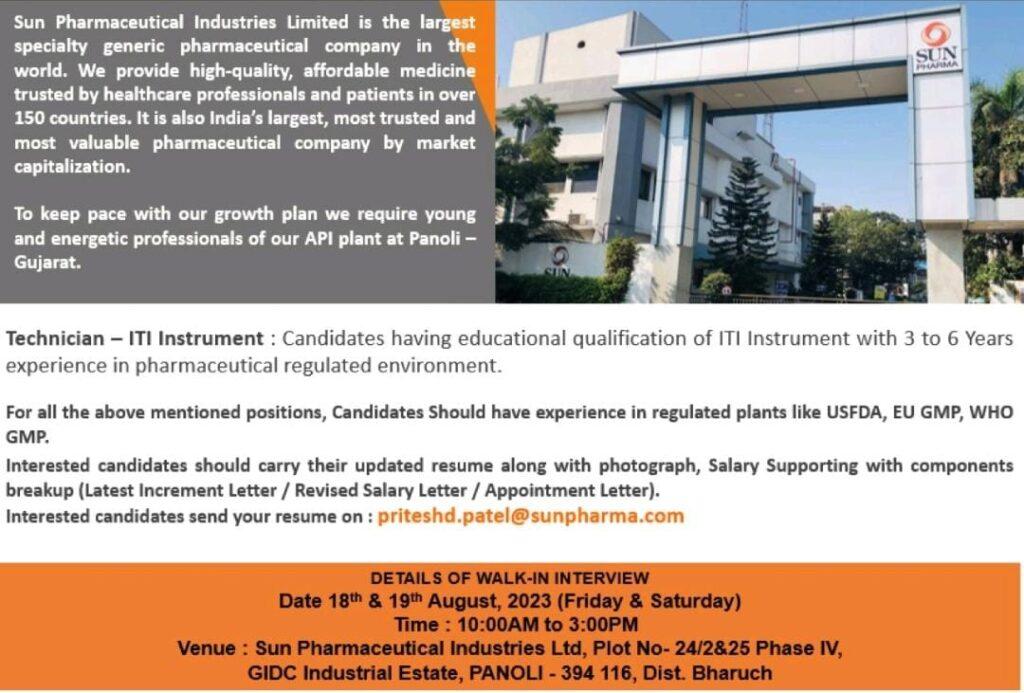 Technician – ITI Instrument: Candidates having educational qualification of ITI Instrument with 3 to 6 Years experience in pharmaceutical regulated environment.
