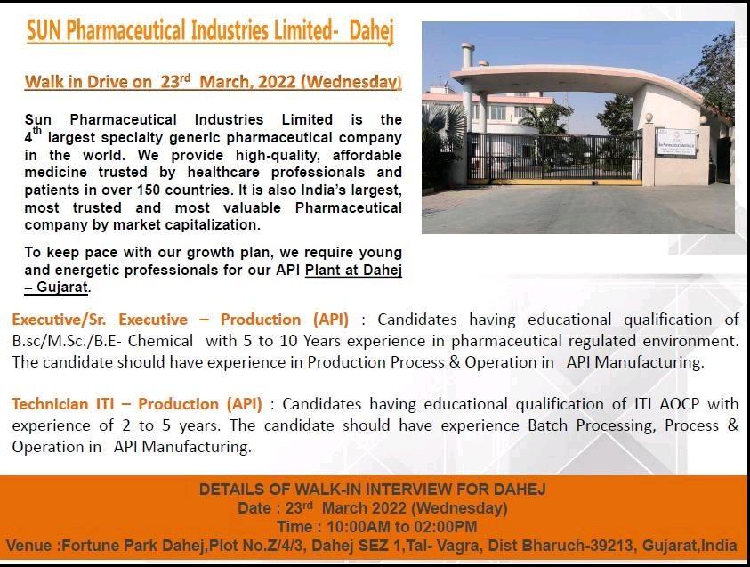 SUN Pharmaceutical Industries Limited, Walk in Drive for Technician/Executive/Sr. Executive in Production on 23rd March, 2022