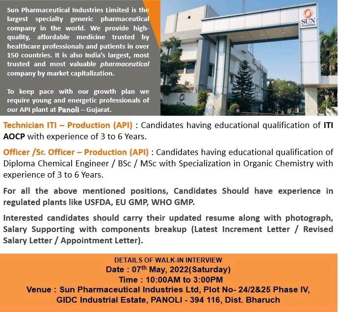 Sun Pharmaceutical Industries Limited Walk In Interview on 07th May, 2022 @PANOLI