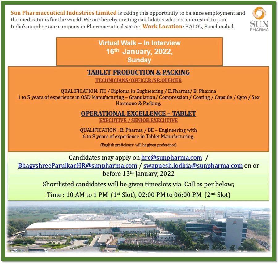Candidates may apply on hrc@sunpharma.com/ BhagyshreeParulkar.HR@sunpharma.com/swapnesh.lodhia@sunpharma.com on or before 13th January, 2022