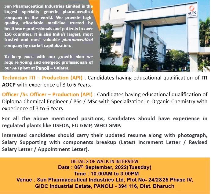 Sun Pharmaceutical Industries Walk In Interview for Technician, Officer, Sr. Officer – Production on 06th September, 2022