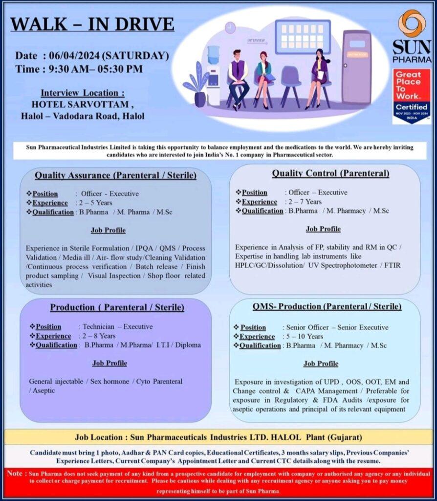 Sun Pharmaceutical walk in drive for QA, QC, Production, QMS on 06/04/2024 (SATURDAY) at Vadodara Road, Halol