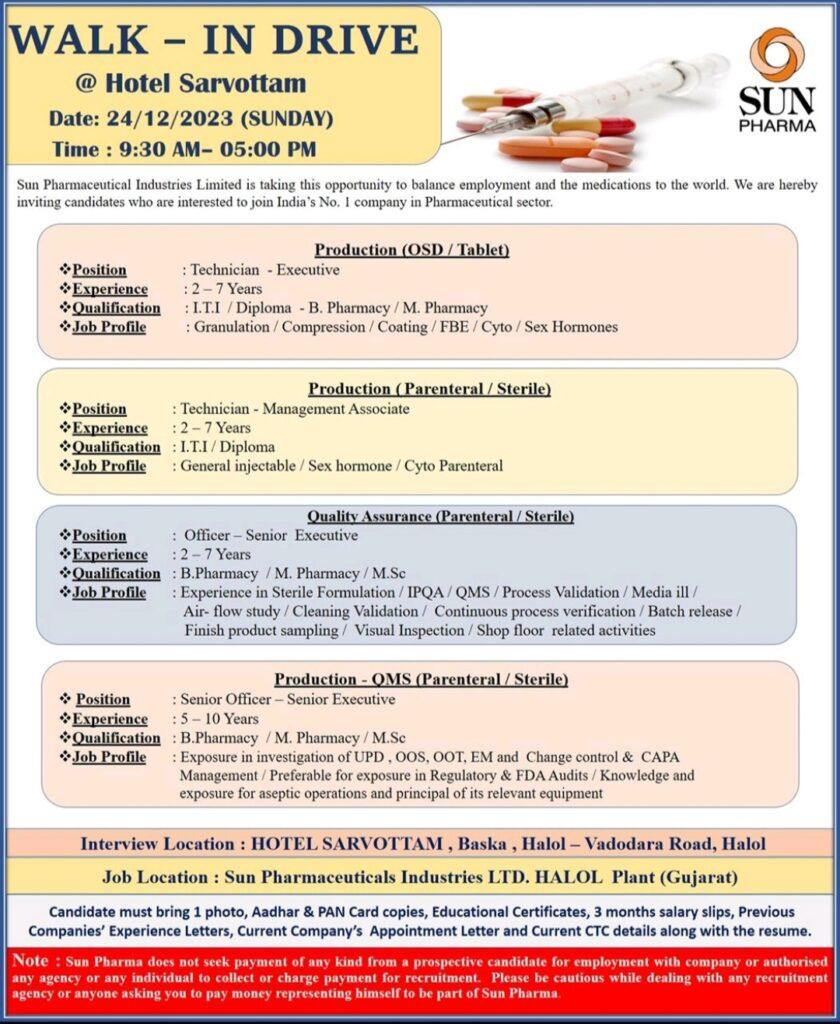 Sun Pharmaceutical Walk In Drive on 24/12/2023 @Hotel Sarvottam, Halol – Vadodara Road, Halol