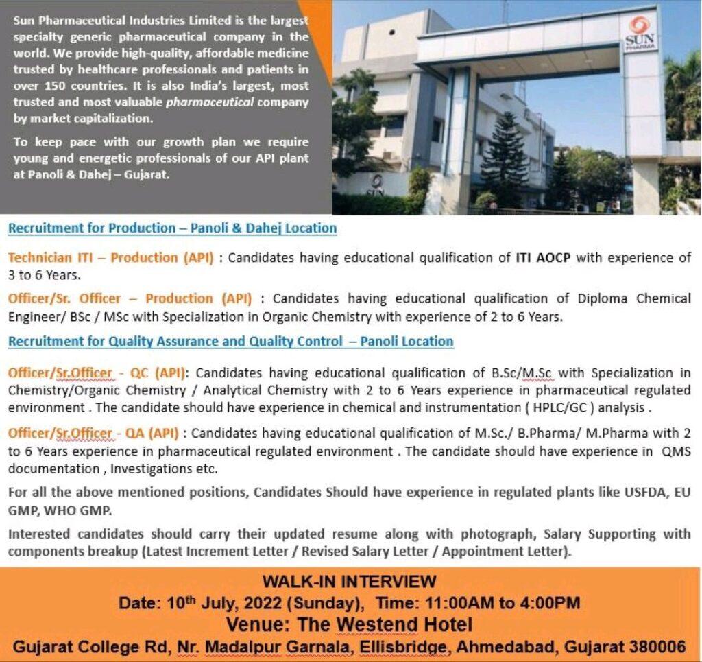 Sun Pharmaceutical Walk In Interview for Production/ Quality Assurance and Quality Control on 10th July, 2022 (Sunday)