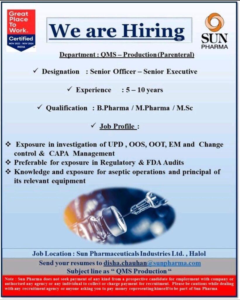 Sun Pharmaceuticals hiring Senior Officer – Senior Executive in QMS – Production (Parenteral) department