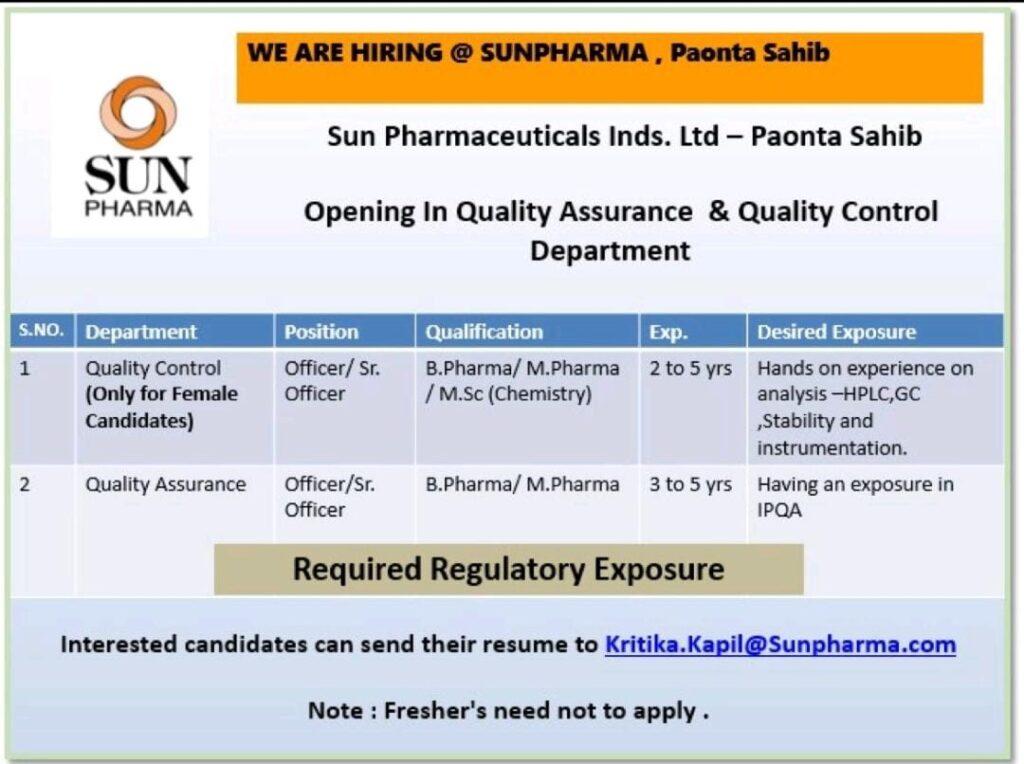 Interested candidates can send their resume to Kritika.Kapil@Sunpharma.com