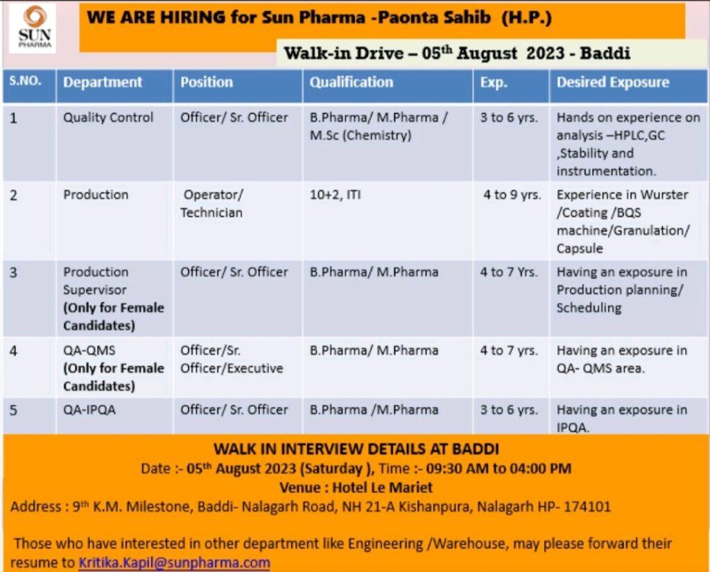 Sun Pharmaceuticals- Walk-in Drive – 05th August 2023 – Baddi for QA/ QC & Production department