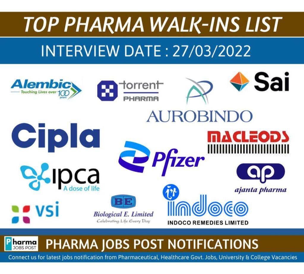 SUNDAY TOP PHARMA WALK-IN INTERVIEW LIST – 27th March, 2022