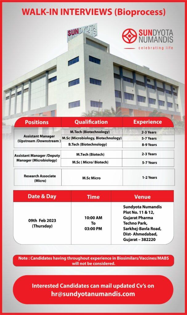 Sundyota Biosciences- Walk In Interview for Assistant Manager/ Deputy Manager/ Research Associate- Upstream, Downstream, Microbiology on 09th Feb 2023