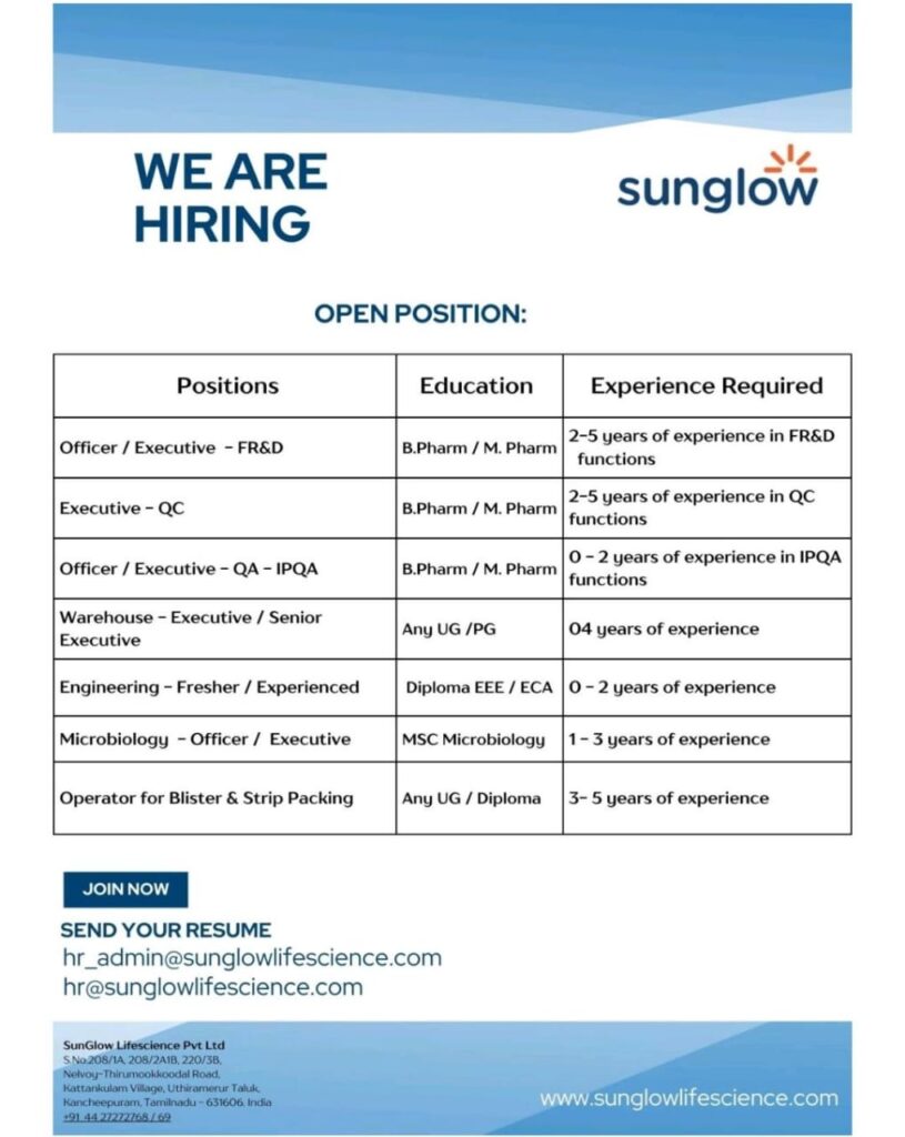 SunGlow Lifescience Hiring Freshers & Experience for FR&D, QC, QA, Warehouse, Engineering & Microbiology department