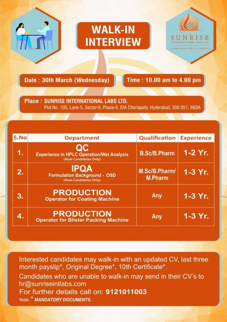 Sunrise International Labs Ltd. walk-in interviews for QC / IPQA / Production on 30th Mar’ 2022 @Hyderabad