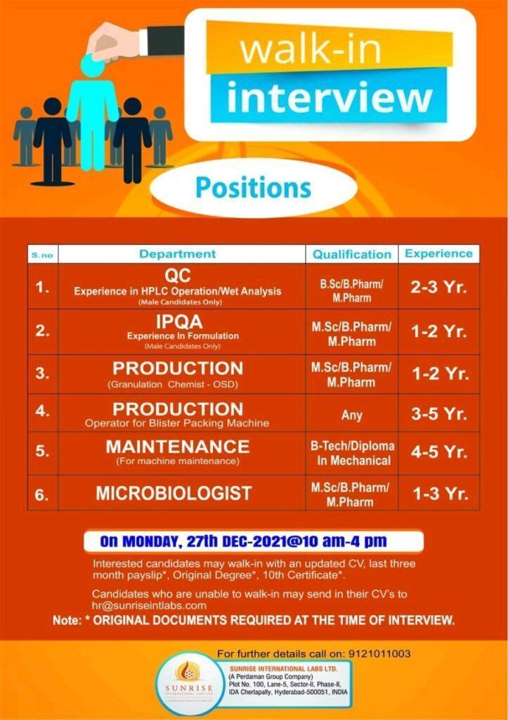 Sunrise International Labs Ltd, Walk-Ins for QC / IPQA / Microbiology / Production / Maintenance on 27th Dec’ 2021