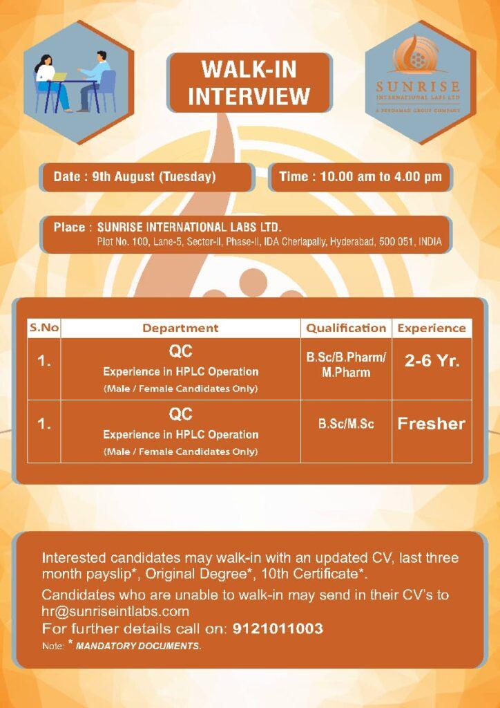 SUNRISE INTERNATIONAL LABS Walk In Interview for Freshers & experience in QC department on 9th August 2022
