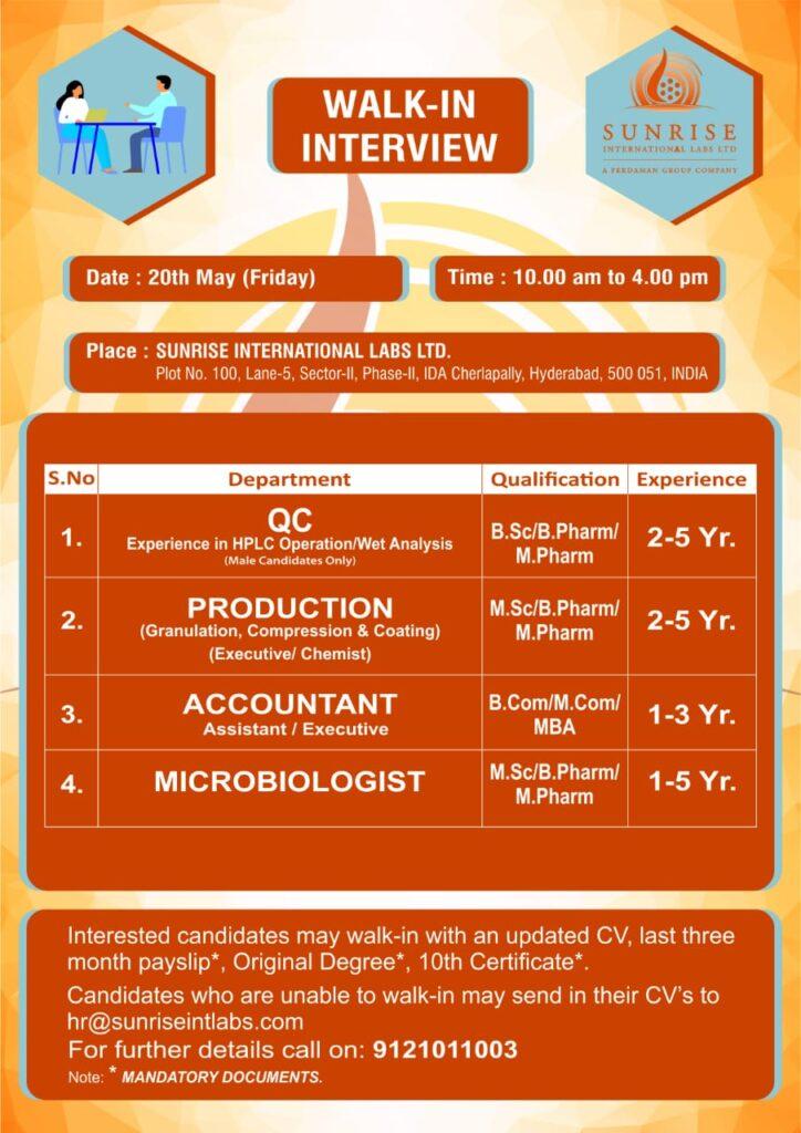 SUNRISE INTERNATIONAL LABS WALK-IN INTERVIEW for QC, Production, ACCOUNTANT & MICROBIOLOGIST on 20th May